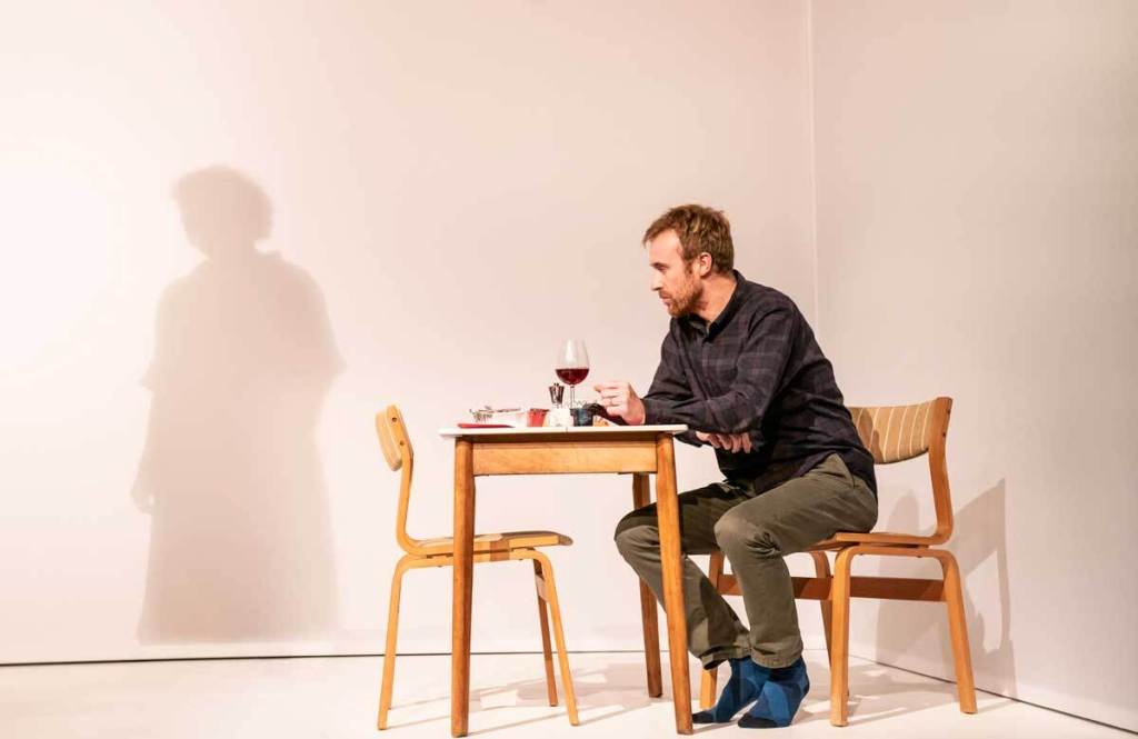 Into this well-conceived space, the production places many comic routines, which often take little more than a minor cues from the original text. Yet Breen generally manages to serve side-splitting laughs while still serving his characters well. While at dinner, Antipholus of Syracuse (Guy Lewis) is propositioned by Adriana (Naomi Sheldon, who gives perhaps the most complex performance of the play). She confuses him for her husband Antipholus of Ephesus and expects him to come home with her. Antipholus of Syracuse’s initial discomfort at her physicality is signalled by his getting out a bottle of hand sanitiser, to sterilise him of the bodily contact. The audience laugh at Lewis’ characterisation of Antipholus as a bumbling, out-of-his-depth Englishman abroad, as well as the meta-irony of the prop and the new significance it has acquired the last two years. (Similarly, the abbess who appears at the end wears a face mask; she is the doctor who will heal the play of its madness.) Yet as Adriana steps up her seduction attempts, a sudden spasm sends a (rather ejaculative) spurt of hand sanitiser high above the stage, towards the audience. It is a magnificent physical gag, but one that speaks to Antipholus’ sordid delight at his circumstances – deciding to play along with the strange events that befalls him due to his misidentification in Ephesus.