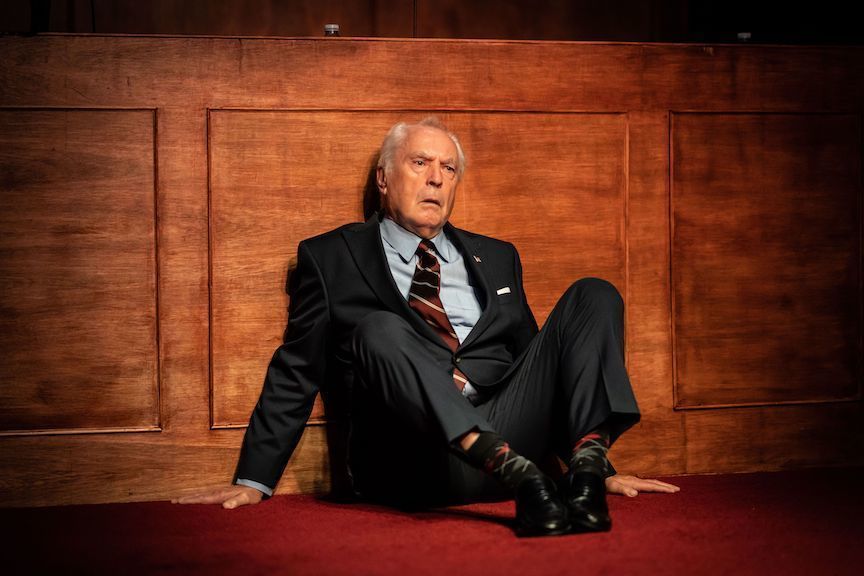 A small moment particularly stands out for me. Roy – the oldest senator, flickering between lucid profundity and forgetful nostalgia and played with sparkling energy by Nicholas Day – recalls that his family ‘lived in England at the time’. Calantini replies ‘I’m sorry to hear that’. We laugh along at what seems to be a well-worn punchline. How awful, to live in Britain. We assume it’s part of Joshua James’ precisely perfected sardonic shtick. But then he asks, in earnest, ‘Were they all drowned’. The laughter chokes as we piece together the throwaway clues Horn has seeded. England is now entirely underwater; ‘They were all drowned’. As fictional as it is, many audience members have just laughed at a tragedy – our own tragedy, in fact.
